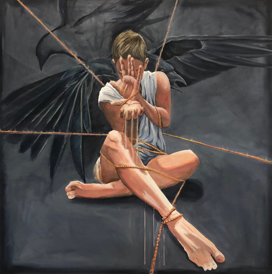 Muninn (memory) sits behind, keening softly, waiting. The ropes continue to burn, yet are bright in the darkness. Each a figure in my life, parent, child, lover. The reason they constrict me, that they have any power at all over me is simply, love. My loves, they anchor me, I could let go, but I would flail, lost in darkness.