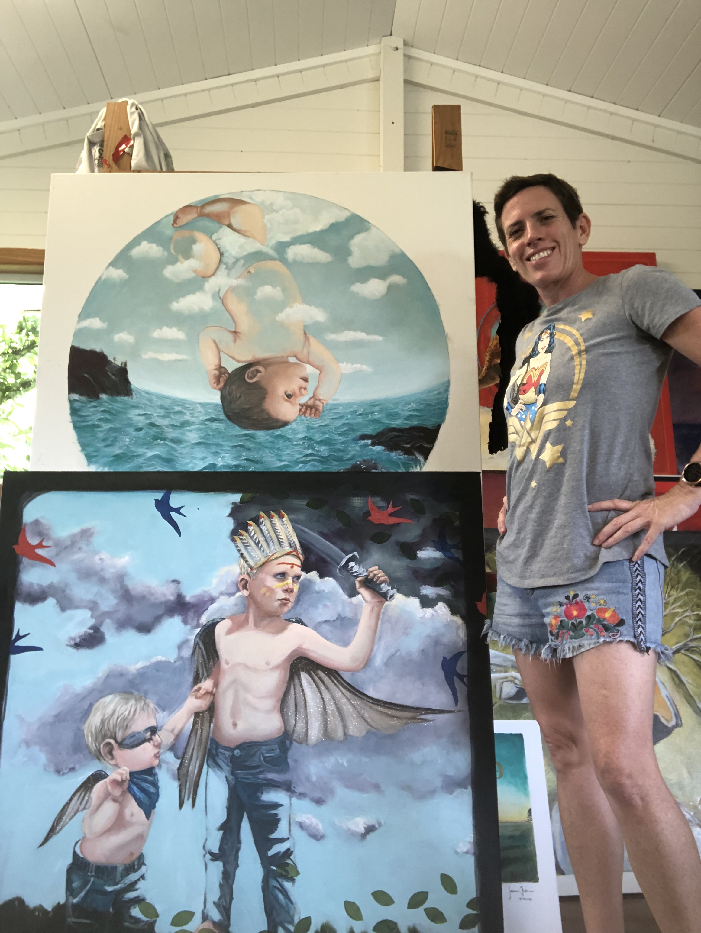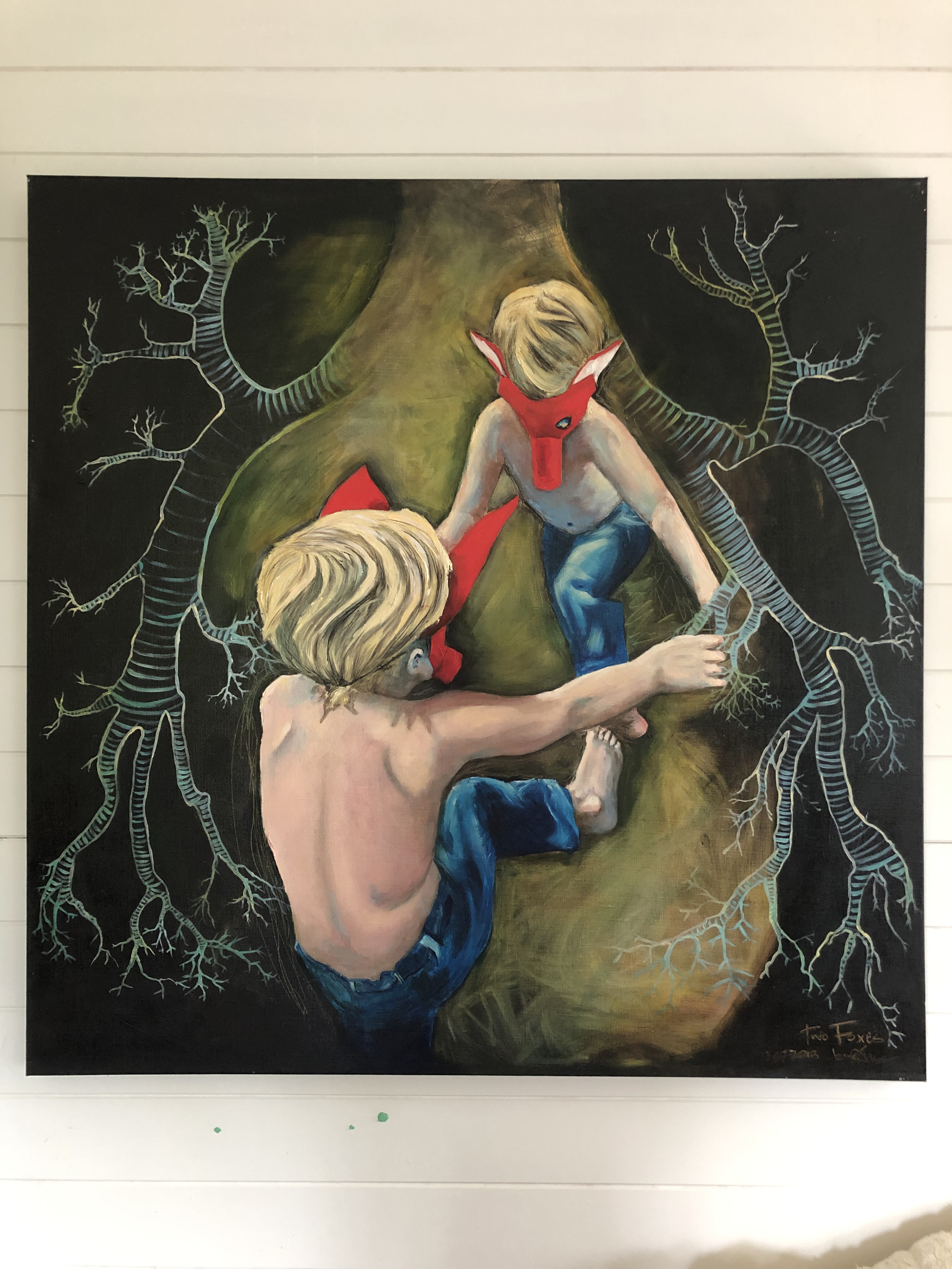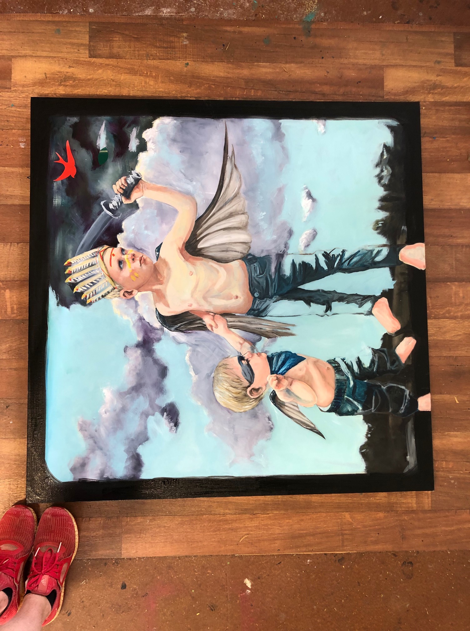 So a fairly long wait it was, and in the meantime I had many very strong images that were dying to be painted, but not being a millionaire to afford thousands of canvas’s I needed to be a bit pragmatic in which one I would paint next. But the brothers just kept cropping up, the big hero brother protecting (& perhaps leading astray ever so slightly) the little brother, who gazes at him in adoration. They just had to come to light, so I chose to boldly (or recklessly depending on how you see it) paint over the wise child, & instead paint heroes.