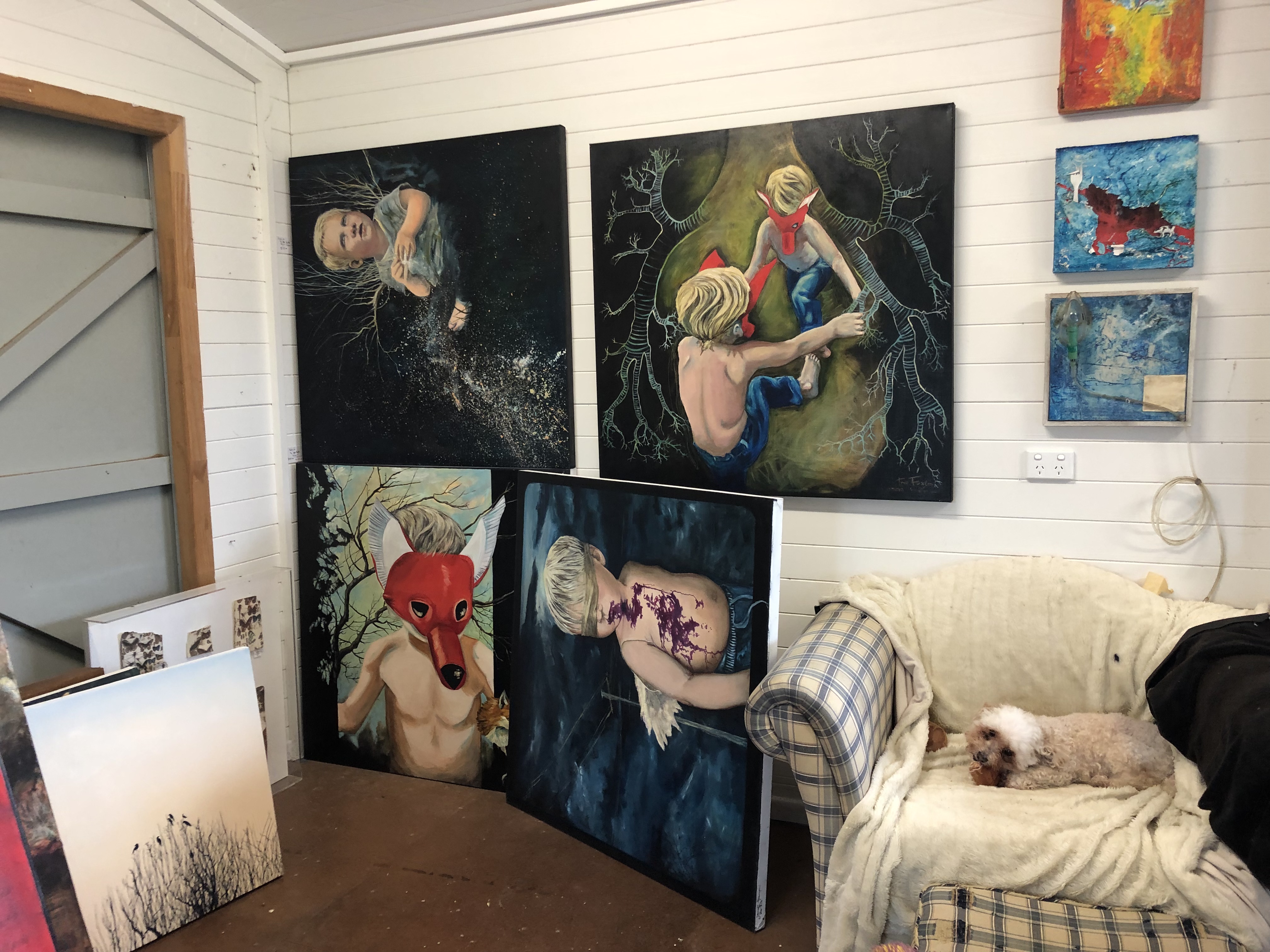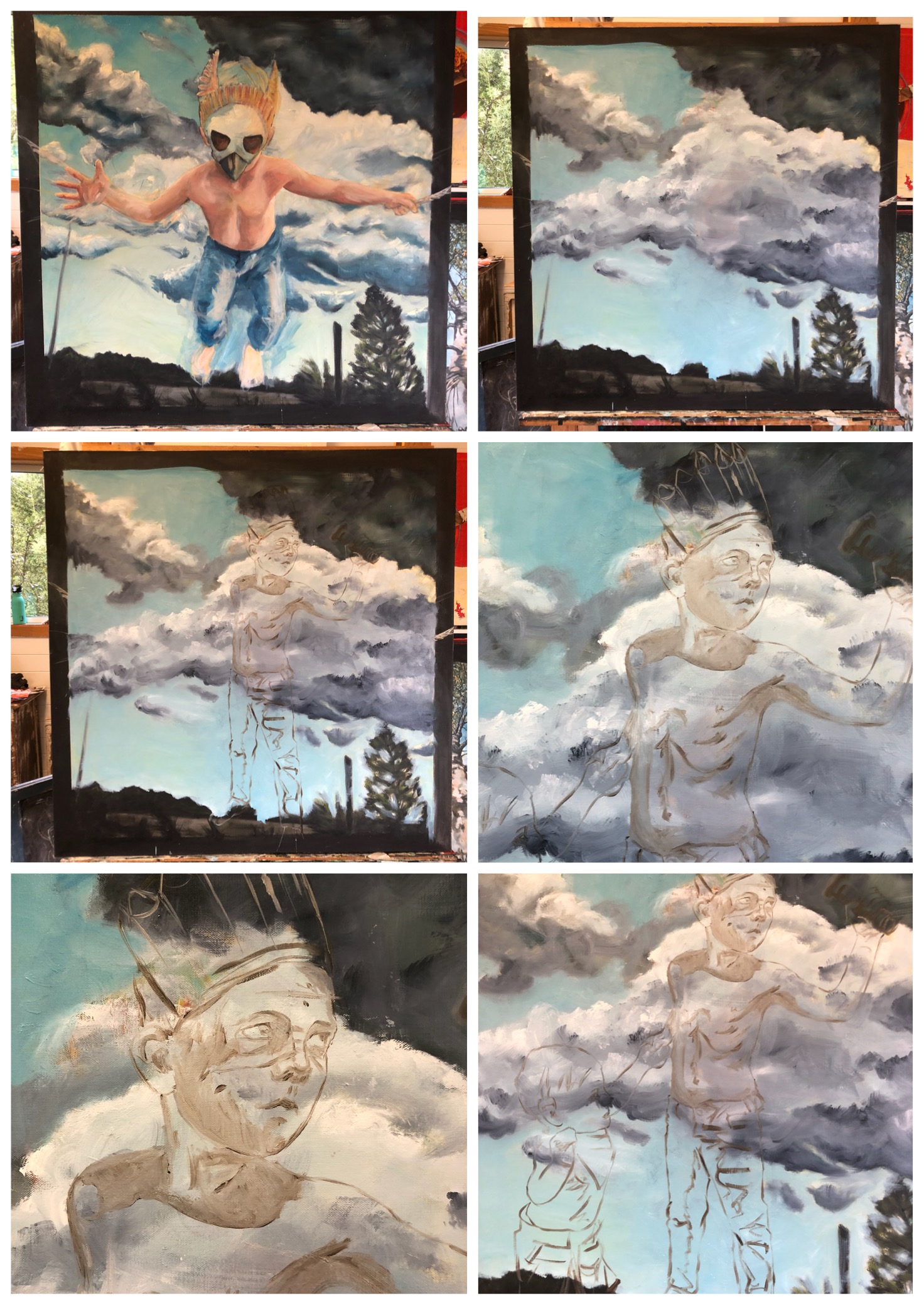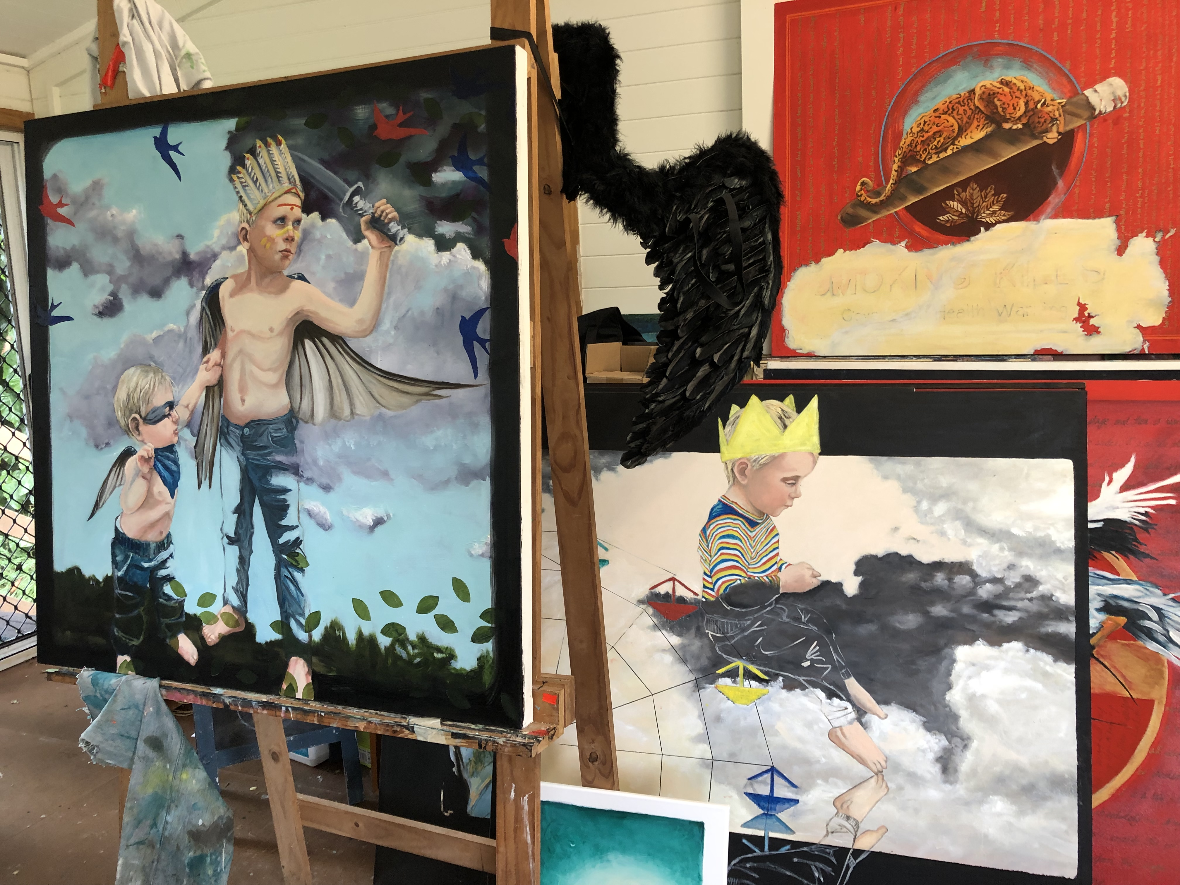 So a fairly long wait it was, and in the meantime I had many very strong images that were dying to be painted, but not being a millionaire to afford thousands of canvas’s I needed to be a bit pragmatic in which one I would paint next. But the brothers just kept cropping up, the big hero brother protecting (& perhaps leading astray ever so slightly) the little brother, who gazes at him in adoration. They just had to come to light, so I chose to boldly (or recklessly depending on how you see it) paint over the wise child, & instead paint heroes.