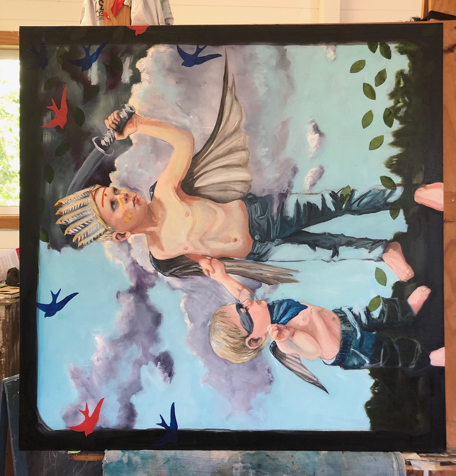 Ping! Zap! Boom! Welcome swallows! I have used swallows in another painting to depict homecoming. They have been used by mariners as tattoos to give them safe passage home as a swallow is migratory, but always comes home, and we happen to have many of these beautiful wee birds right here, in fact roosting in the garage, generations of them, pooing on the cars.