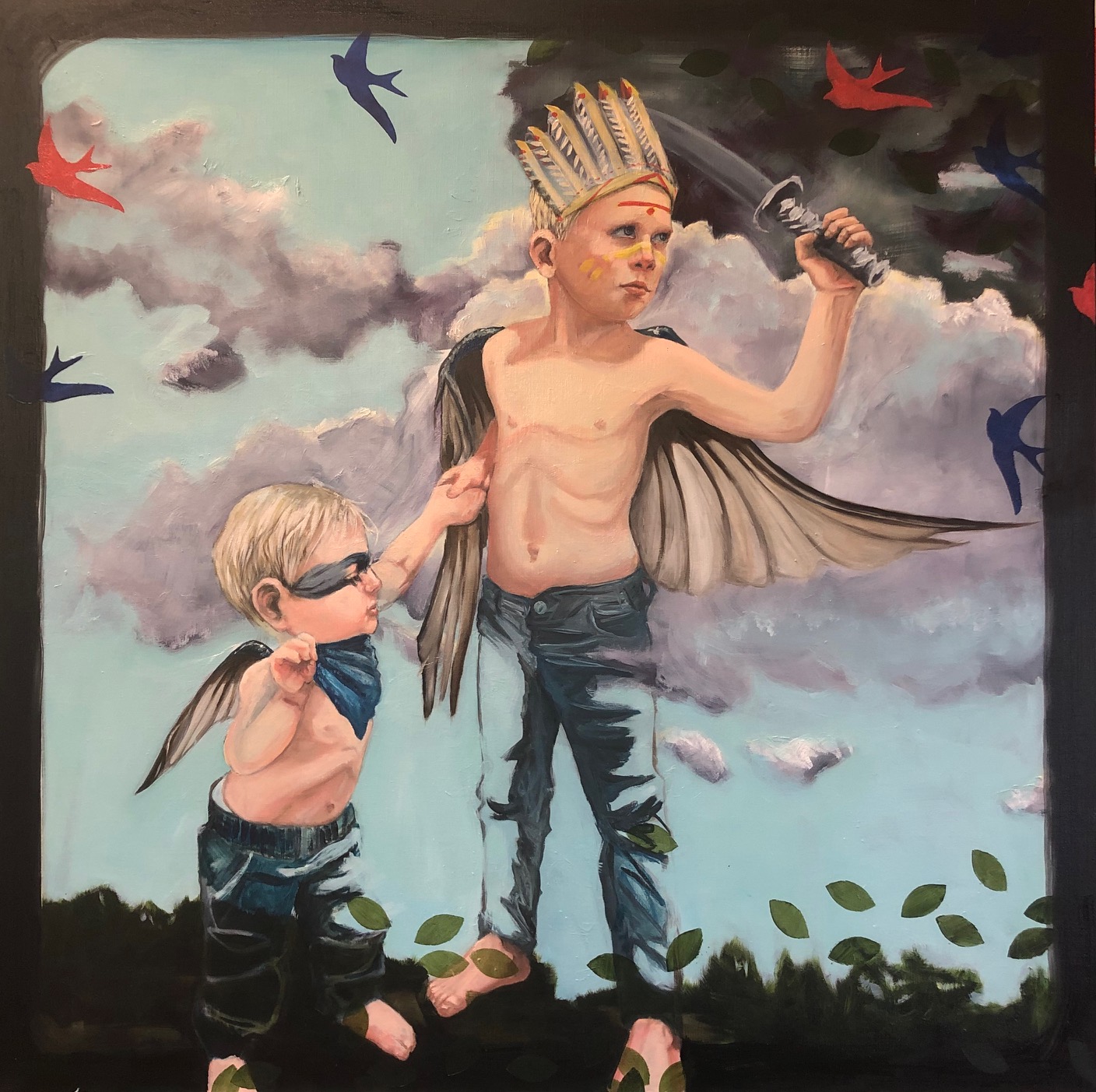 The children stand brave, the elder the hero-protector.The littlest the sidekick, steady & true, gazing, adoring, at his brother. Swallow wings sprout from their backs, poised to give them safe passage.The swallow migrates, but no matter how far it roams, it alwaysreturnshome;the brothers are an anchor to each other, always.Family.