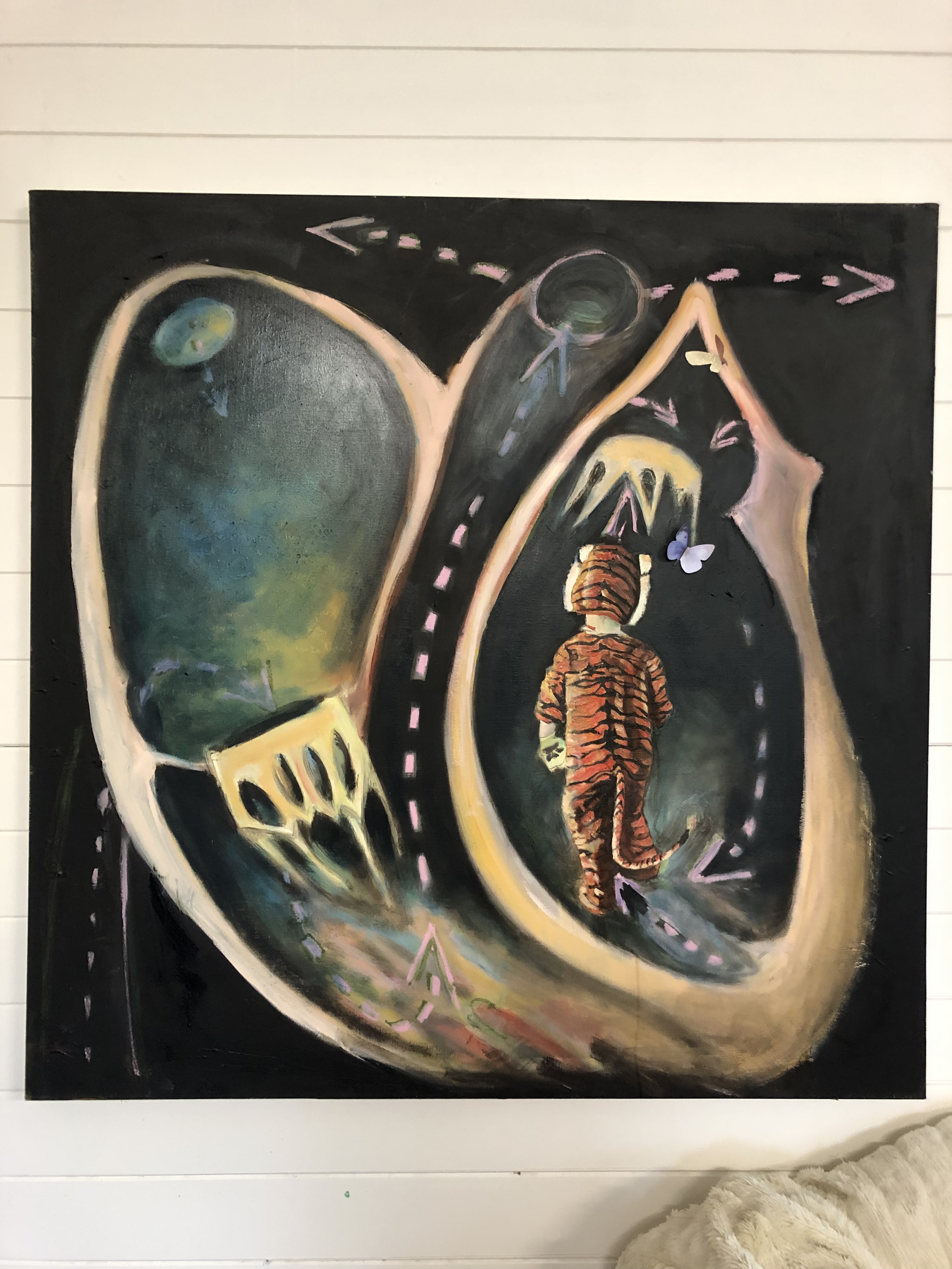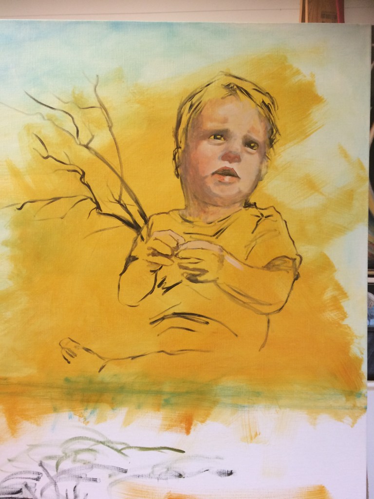 I had an idea of S wearing an owl mask & taking flight, originally it was to be called something about enlightenment, regarding the wisdom of children leaping gleefully into the unknown. This image just didn’t work & I couldn’t put my finger on the why. So to the back of the pile of ‘waiting’ paintings it went, waiting for the light bulb moment, perhaps a thought bolting from the blue, or an image that clutched my gut. Obviously that can take a while!