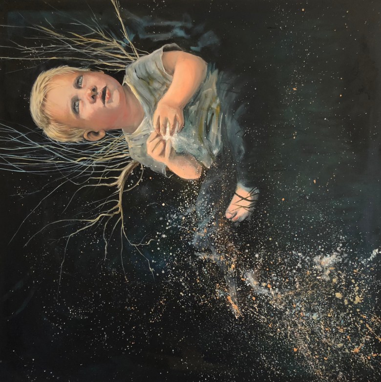 This little quote when Samson was 4 and Fox was a baby was the catalyst for this painting. I had asked Sam to check on the Baby, which he did, & as babies do, Fox was stuffing anything into his mouth, the anything happened to be a muslin wrap printed with stars. From this I had an enduring snapshot in my brain of my giant baby consuming stars out in the universe, but the image itself didn’t come until he was 1.